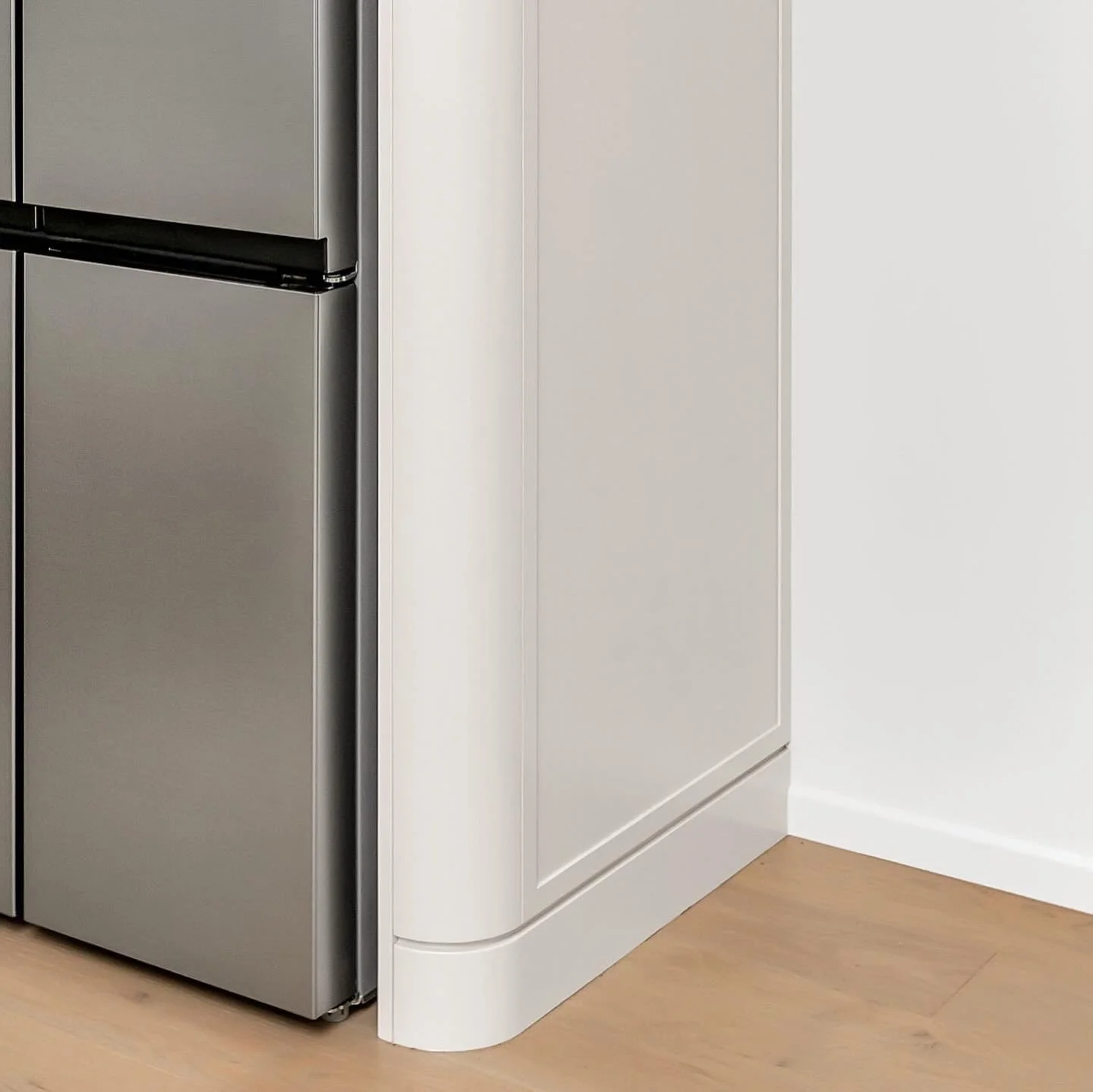 We relocated the hallway doors to the end of the rooms, giving more wall space for furniture, lightened up the walls and kitchen, and sourced new furniture which fitted and suited the space. A new kitchen was designed, opting for lighter tones and textures to keep the space as light as possible, classic in styling, with considered detailing, intentionally juxtaposing straight lines with gentle curves. We layered the key furniture pieces with soft furnishings such as rugs and cushions, lamps, light fixtures, and styling accents.